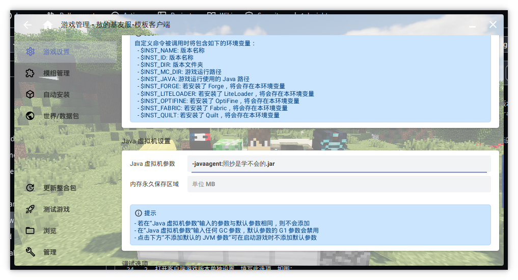 2. 打开客户端游戏版本单独设置,填写JVM虚拟机选项,如图: