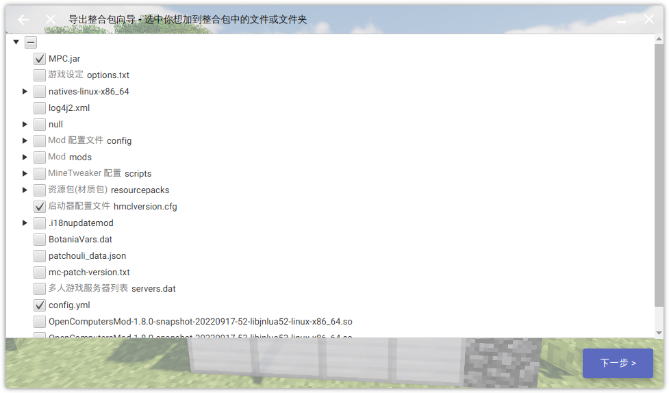 2. 导出整合包,信息可按照您的喜好填写,但您必须勾选下列文件,这是咒语能否起效的关键!